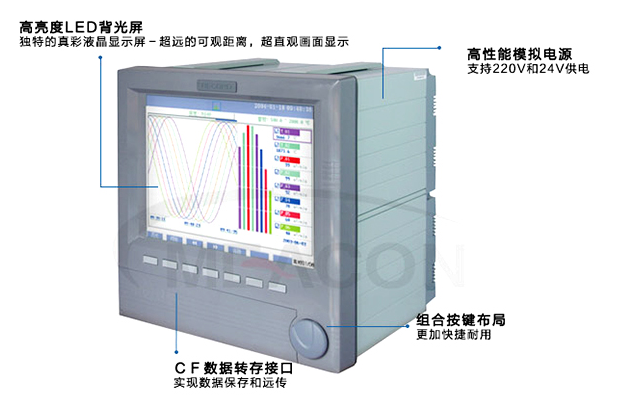 MIK-R8000D温度记录仪集显示、处理、记录、积算、报警和配电等多种功能于一身;采用10.4英寸640x480TFT真彩液晶显示屏。配以中文显示界面。画面大而且清晰;按钮和旋钮联用使操作更灵活简便,符合工业人员的操作习惯;内部采用超大容量的NANA FLASH作为内部储存介质,真正实现无纸记录仪强大的记录功能,同时采用CF卡作为外部储存介质,可将需要保存的数据通过CF卡转存至计算机或其他设备中永久保存或打印。