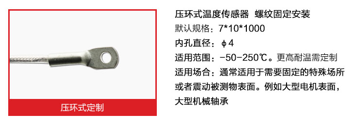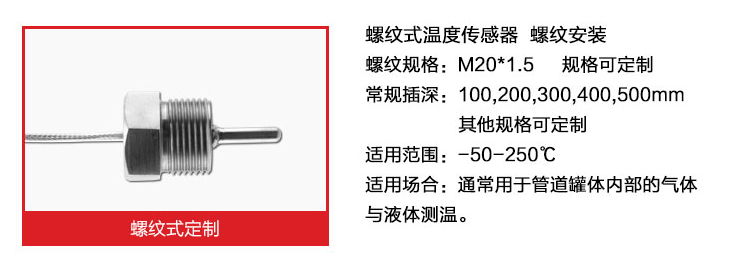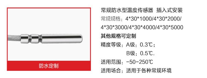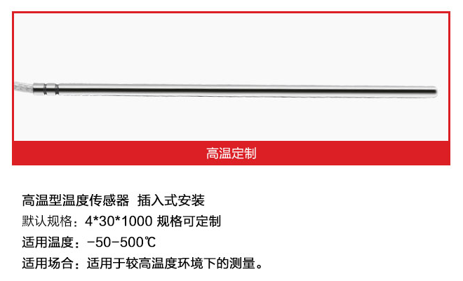 引线式热电阻温度传感器全部采用的进口芯体,采用不锈钢外壳,从而达到稳定性好,精度高,抗震性能强等特点。引线式热电阻温度传感器可以测量液体、蒸汽和气体介质以及固体表面温度,广泛应用于大棚、仓库、运输车、冷库、实验室、生产车间等环境的温度检测。